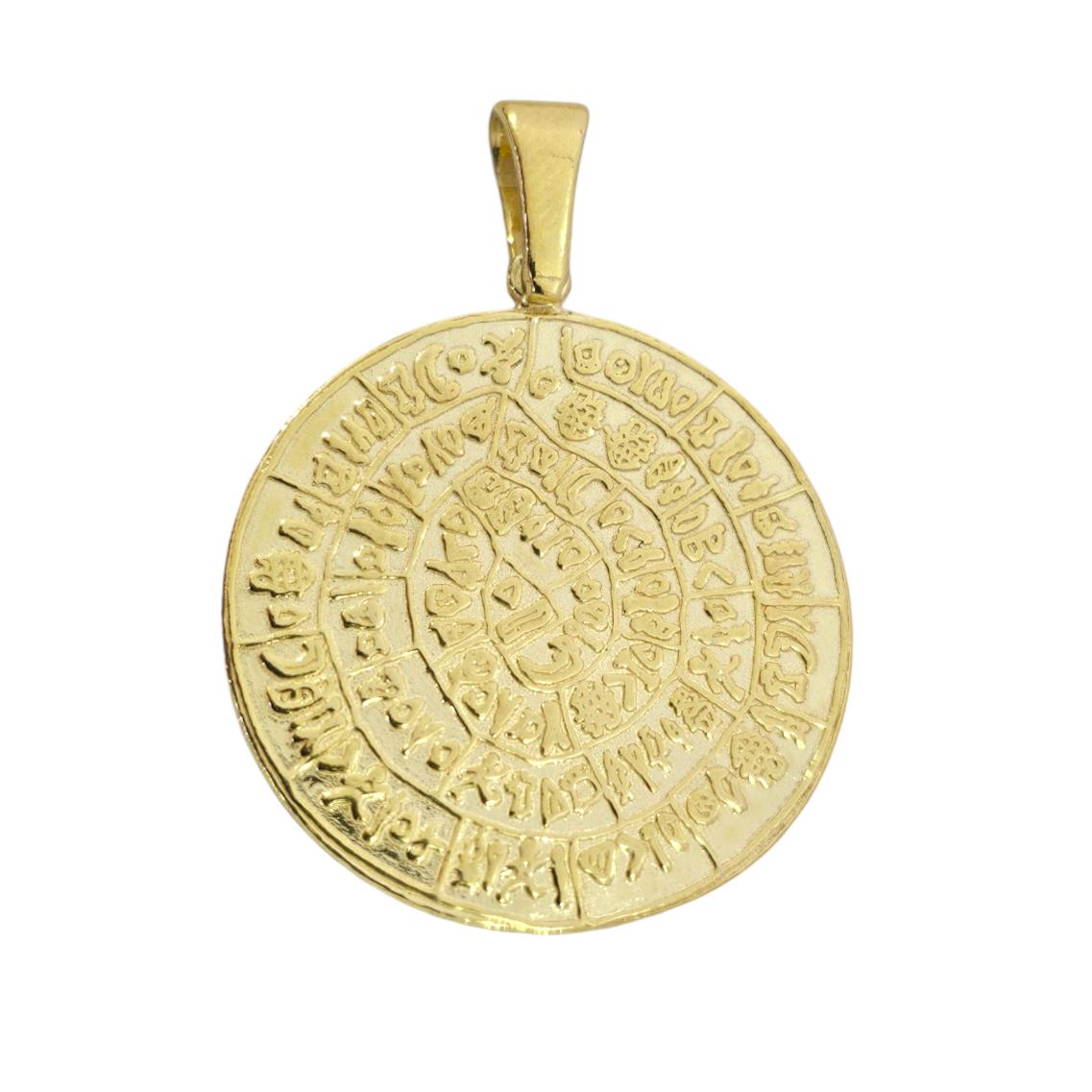 The Phaistos Disc is an ancient artifact from the Minoan civilization, discovered on the island of Crete. When it is replicated as a 925 gold-plated pendant, it combines historical significance with modern craftsmanship.