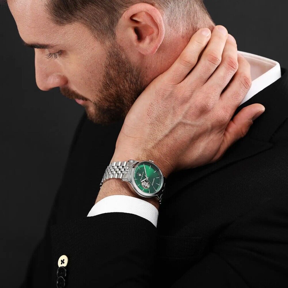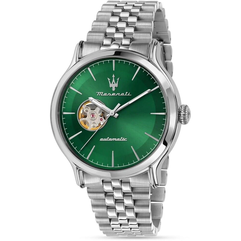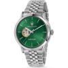 Maserati Epoca R8823118010 is a watch designed for the elegant man. The device consists of a round envelope and a stylish bracelet, using high-quality stainless steel in a silver tone. The green open-heart dial is decorated with a sunray cut and covered with sapphire glass for protection against external damage. Whats more, the model operates on the basis of the NH70A automatic movement, which has a walk reserve of 41 hours.