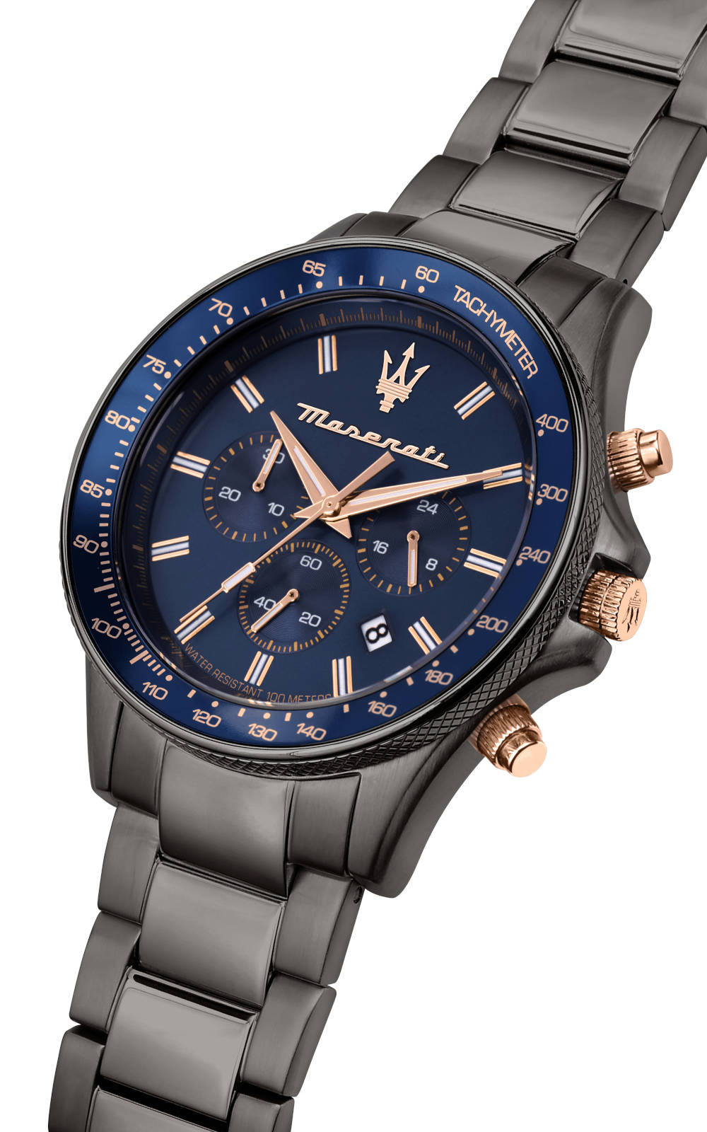 This Maserati watch has a colour coated stainless steel case 44 mm in diameter and is fitted with a metal strap. Inside the case lies a Miyota movement and the watch features a Mineral crystal.